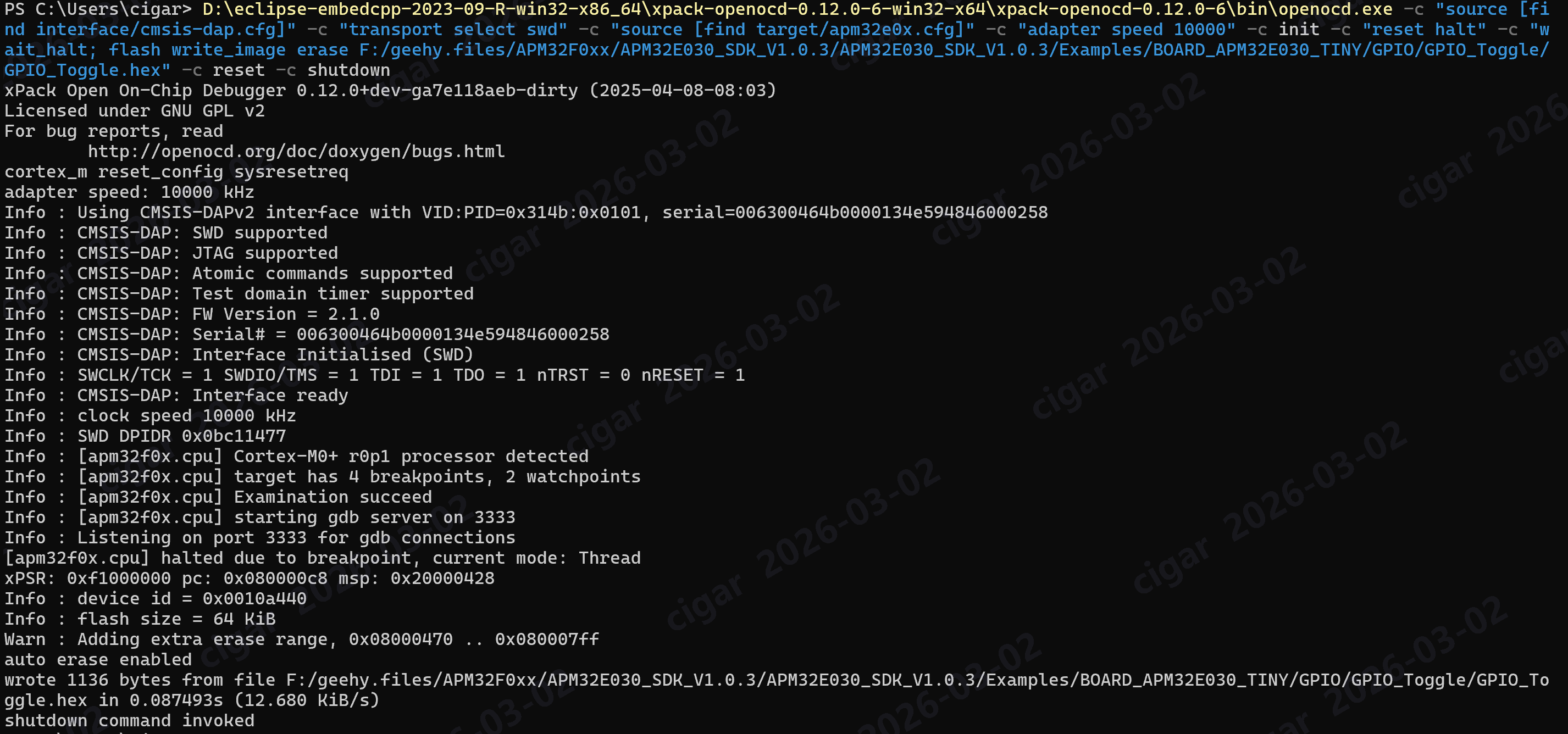 For developers who prefer OpenOCD, Geehy provides a customized version that includes configuration files for APM32/G32 chips.