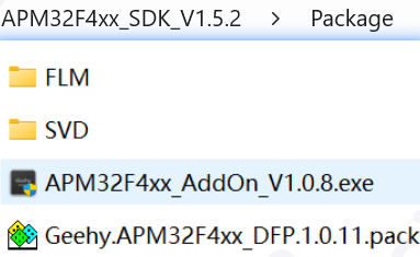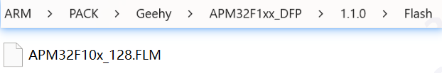 You can get the “.pack” CMSIS-Pack file, “.FLM” Flash Algorithm, “.svd” scattered file from Geehy SDK.