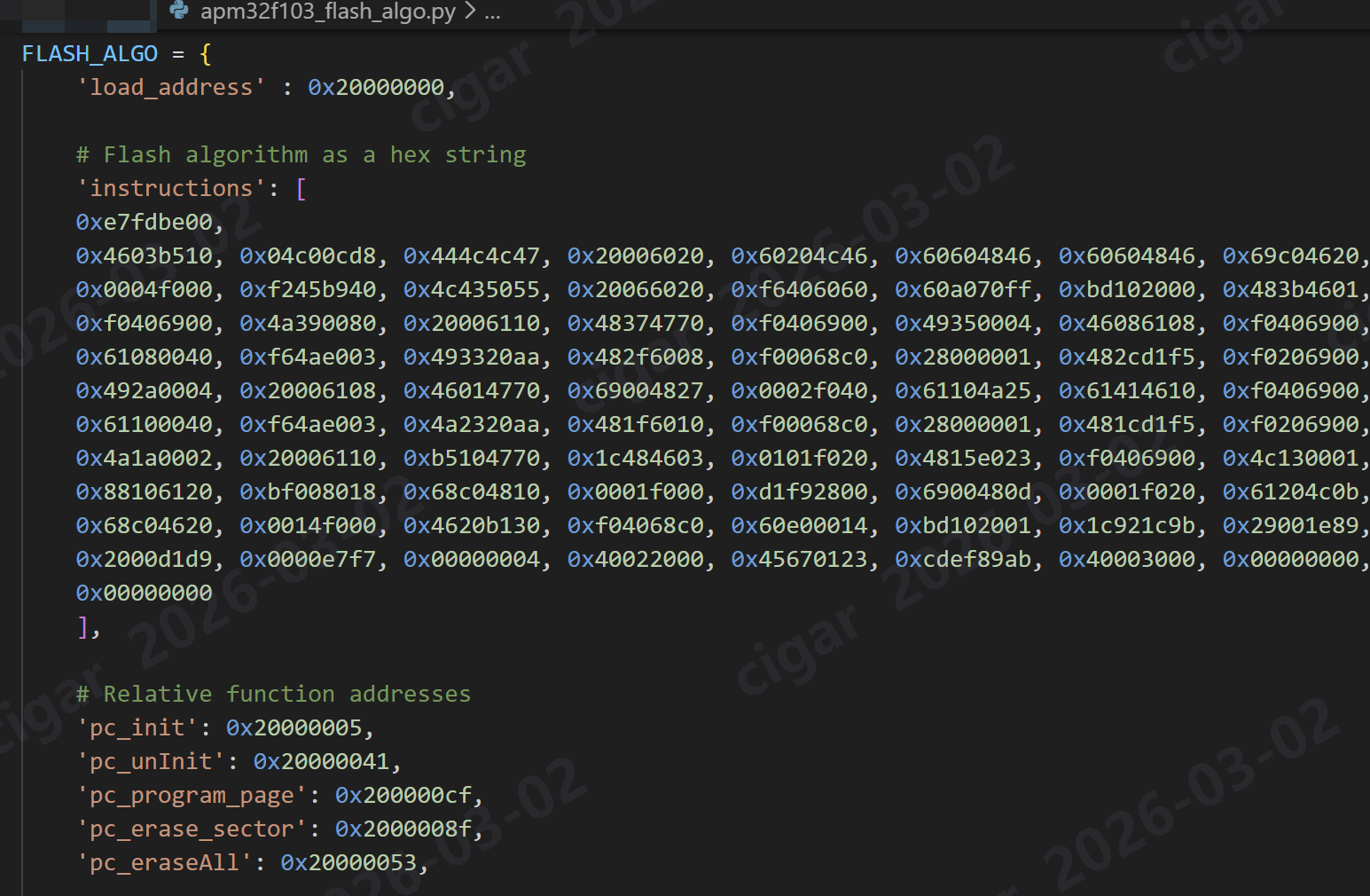 This method extracts the flash algorithm from the SDK and embeds it into pyOCD. This is useful for creating a standalone Python environment that doesn’t rely on external Pack files. We will use the APM32F103 as an example.