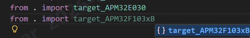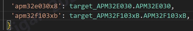 Output: The terminal will list available targets (e.g., APM32E103ZE, APM32E103VC). Note down the specific name you need.