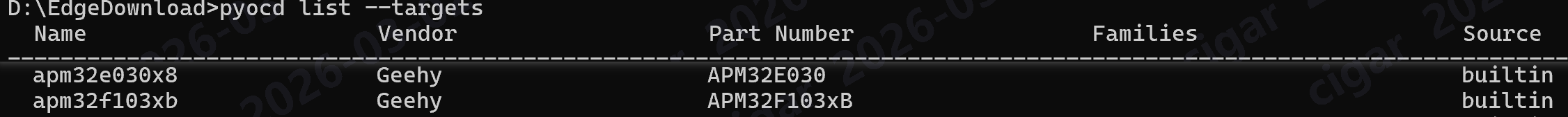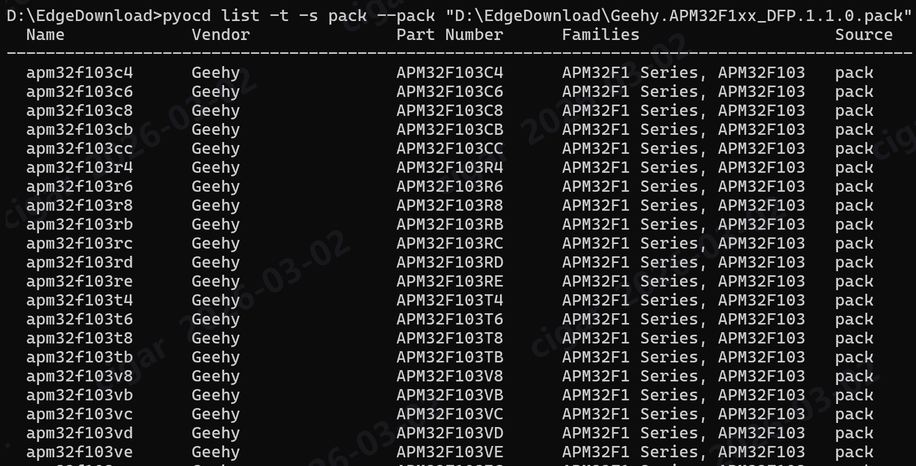 pyocd list -t -s pack --pack "D:\Geehy_SDK\Package\Geehy.APM32E1xx_DFP.1.0.3.pack"