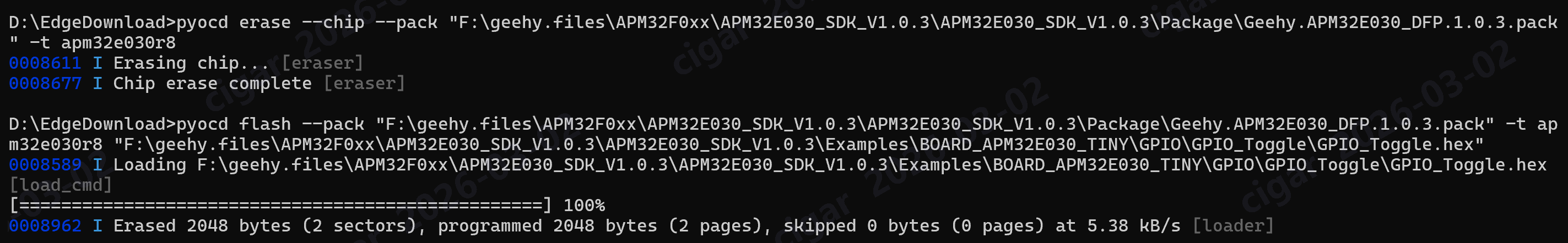 pyocd flash --pack "D:\Geehy_SDK\Package\Geehy.APM32E1xx_DFP.1.0.3.pack" -t APM32E103ZE -f 4000000 project.hex