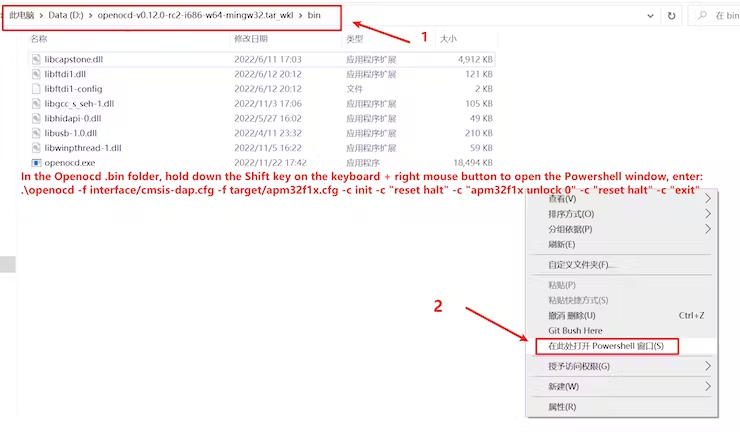 In the Openocd.bin folder, hold down the Shift key on the keyboard + right mouse button to open the Powershell window, enter: