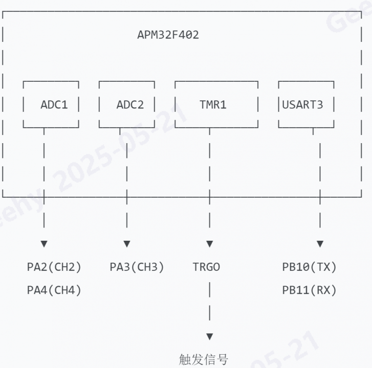 - Achieve synchronous triggering of ADC1 and ADC2 to eliminate sampling time differences between channels.
