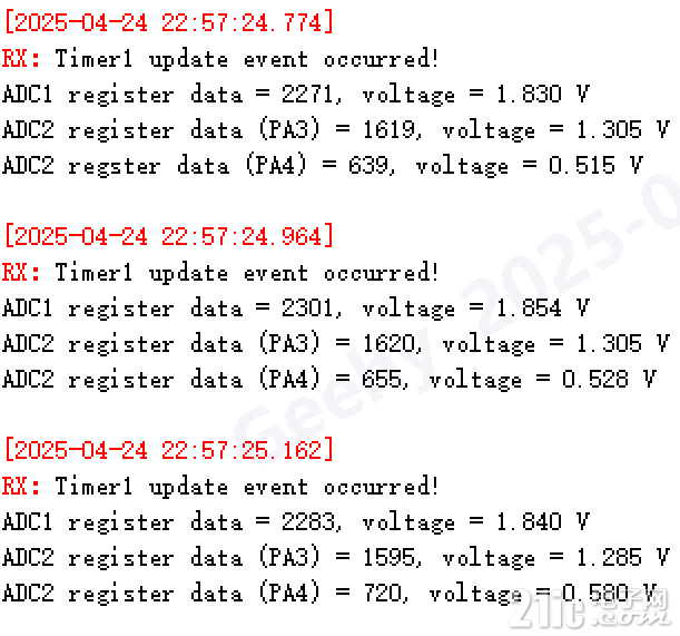 printf("ADC1 (PA2) Data: %d, Voltage: %.3f V\r\n", adc1_value, voltage);