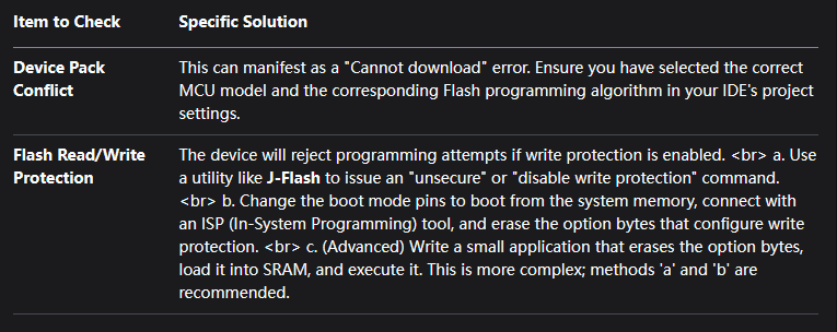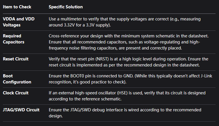 During MCU development, even with a properly configured development environment (Keil, J-Link drivers, and device packs correctly installed) where programming and execution were previously successful, issues can arise after modifying hardware or code. You might encounter problems such as the J-Link debugger not being recognized, the device being recognized but failing to program, or the device programming successfully but the application failing to run.