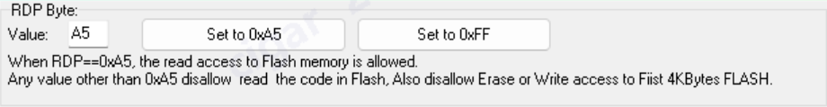 - Read Protection: 2 levels, no protection or basic protection, when the Option Byte is not 0xA5, Flash cannot be read out, and the full chip will be erased while the programmer removes the read protection.