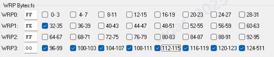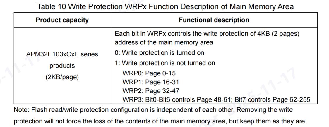 Write Protection: 1 Page per bit, on APM32E103, 2KB per bit.