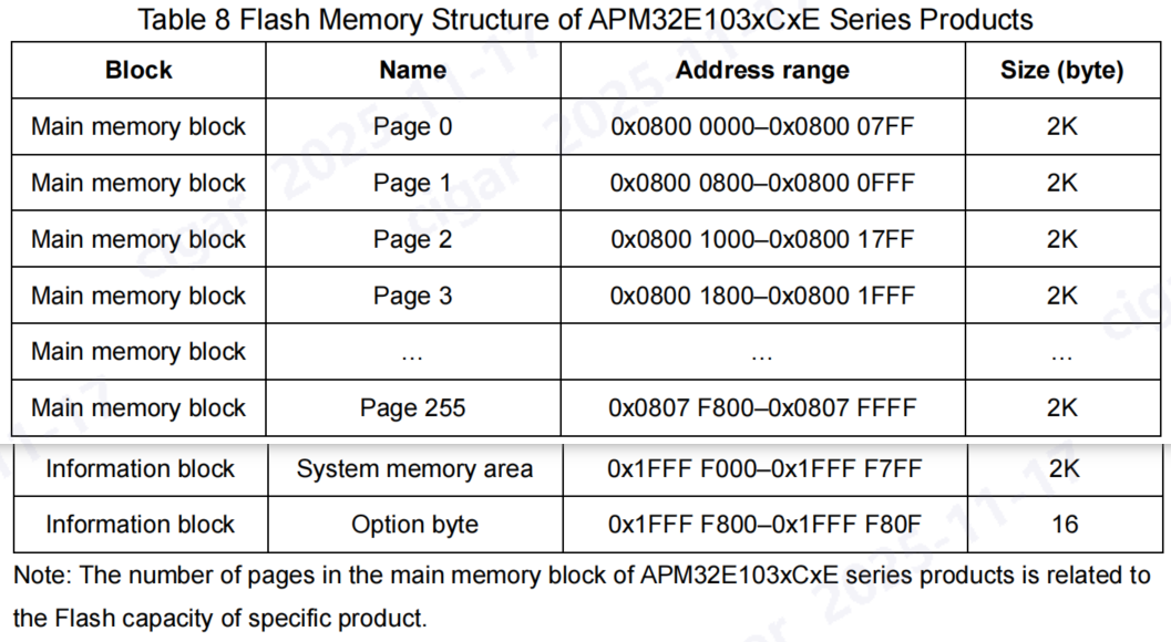 The APM32E103 series integrates 512KB of 55nm eFlash, capable of running at up to 120MHz with wait states. It also supports basic protection and option byte configuration features. To successfully enable code read and write protection, please pay attention to the configuration of the option bytes. These option bytes are placed in the system memory area and are not affected by a full-chip Flash erase.