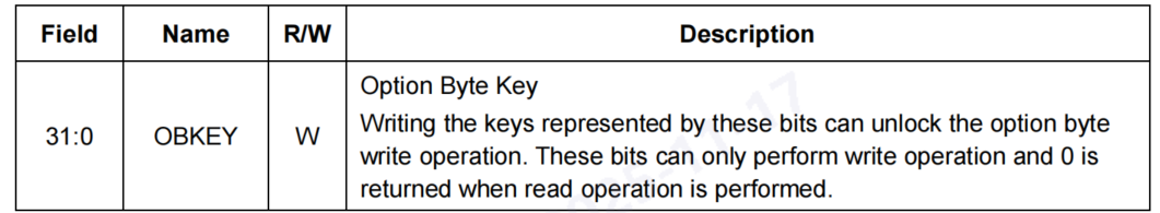 The option byte does not support “software lock”. The user should pay special attention to that every time after the value of the option byte is modified, the system must be reset to make it effective.