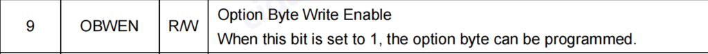 Before attempting to program or erase option bytes, you must set OBWEN (bit 9) to 1 to enable write accessd; _clear this bit and write operation will be disabled_.**
