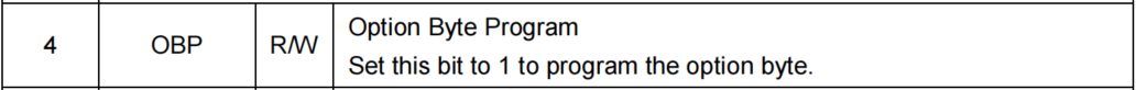 After writing the desired option byte data to the option byte memory space, you must set OBP (bit 4) to 1 to initiate the programming operation.