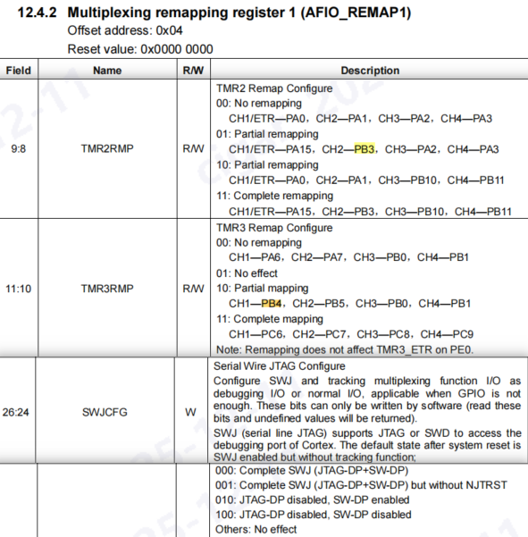 After this you can control PB3 & PB4 as digital output. If you need alternate functions, please check the ohter registers in AFIO_REMAP1 as well, such as TMR2RMP, TMR3RMP.
