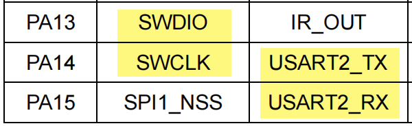 The pin PA14 is default to SWD_SWCLK functionality. By multiplexing the SWD clock pin for UART communication, I could save valuable GPIO resources for other tasks.
