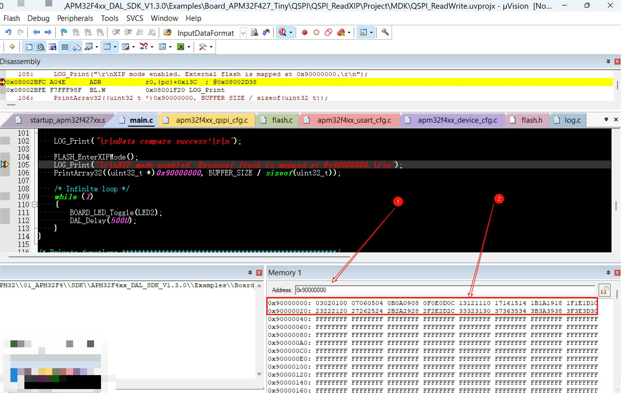 Debugger Memory Window (e.g., MDK, IAR): Directly view the 0×90000000 region. Seeing the same content as in the Flash confirms a seamless integration.