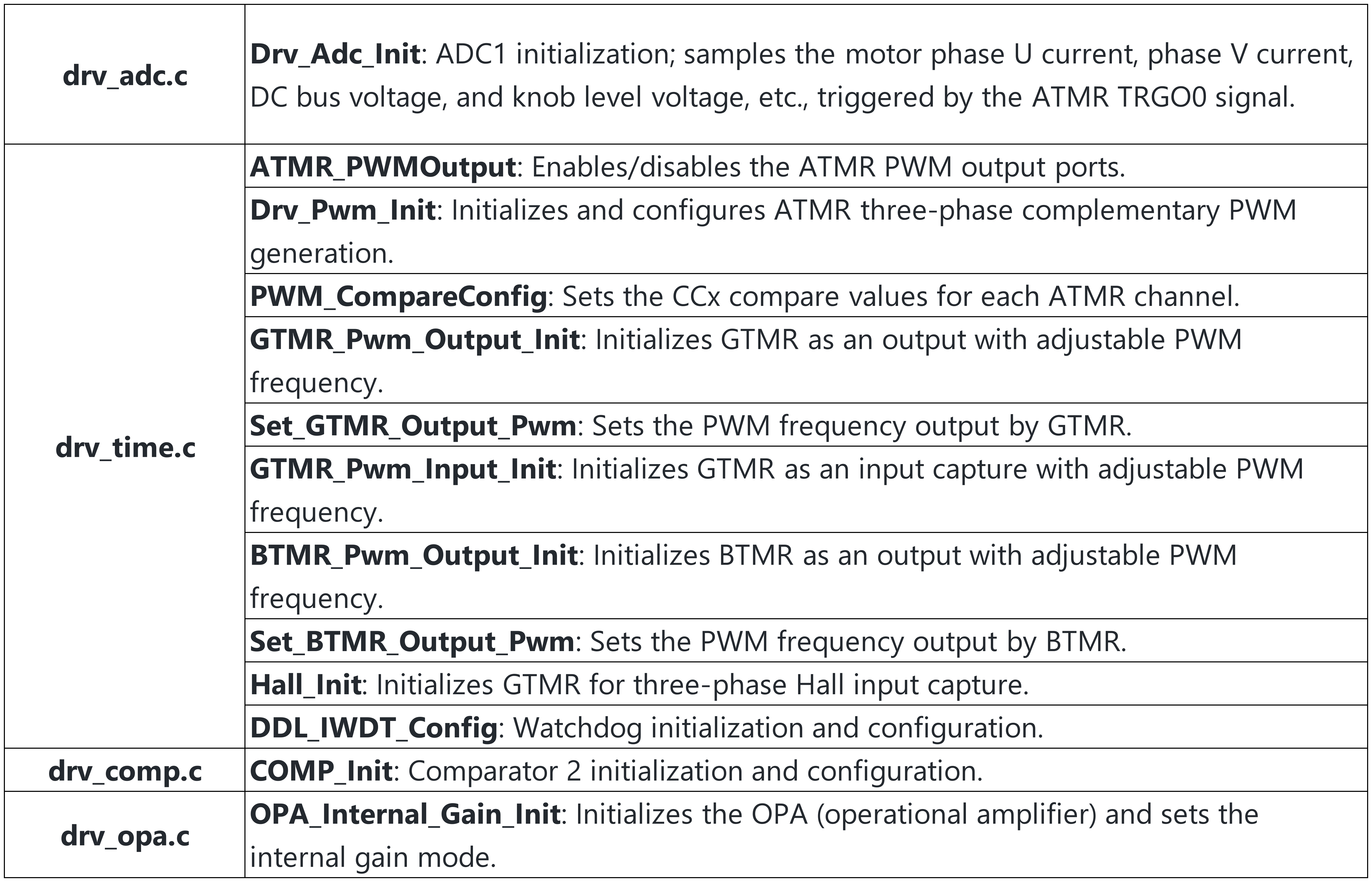 drv_comp.c, drv_opa.c): Configures internal comparators for microsecond-level over-current shutdown and OP-Amps for signal conditioning.
