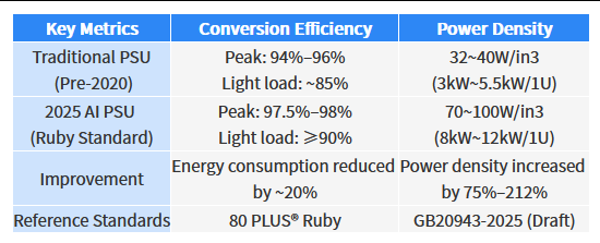 In 2025, the 80 PLUS® program introduced the new Ruby efficiency tier, further accelerating performance upgrades in AI server power supplies. This new standard emphasizes comprehensive improvements in both power conversion efficiency and power density.