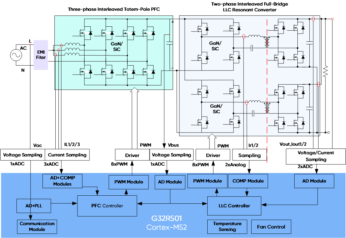 - Front stage: Three-phase interleaved totem-pole PFC, using GaN or SiC MOSFETs in the high-frequency bridge.